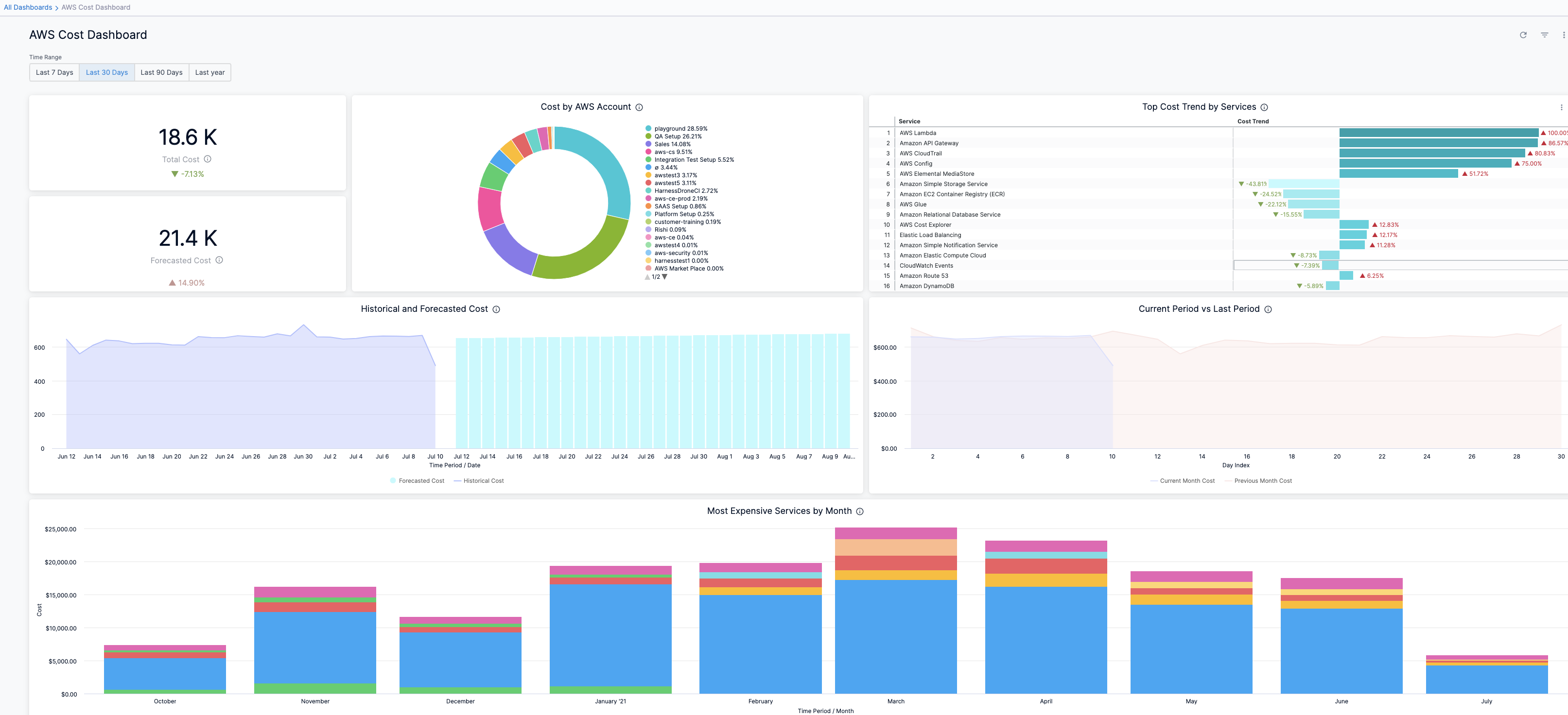Harness provides pre-loaded By Harness (pre-defined) and Custom (user-defined) dashboards to visualize cloud cost data across clusters and cloud accounts. Using the AWS Cost Dashboard you can: