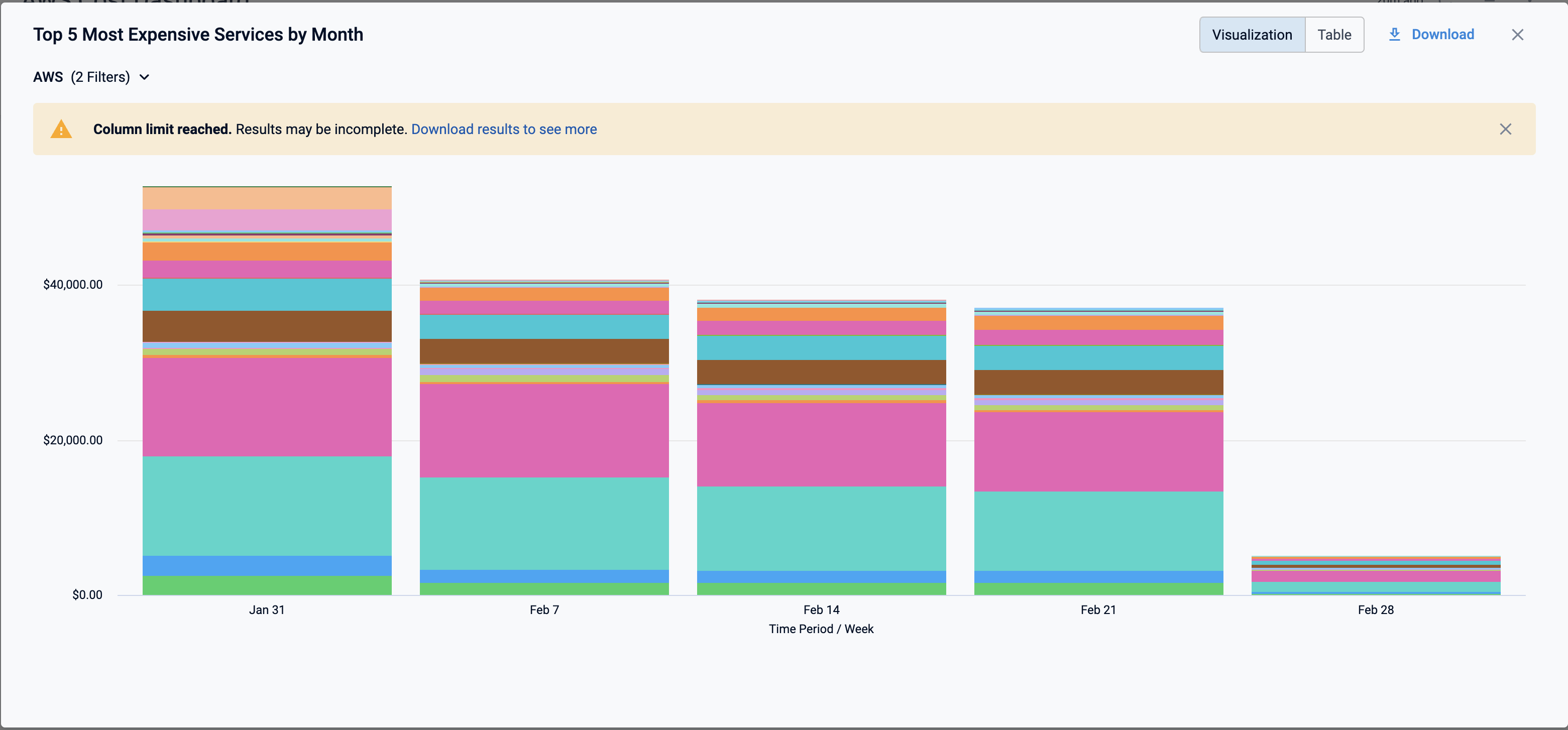 The cost for the selected Time period is displayed. You can toggle between the Visualization tab that displays the data in the form of a graph and the Table tab that displays the actual cost. You can download this data to your local system.