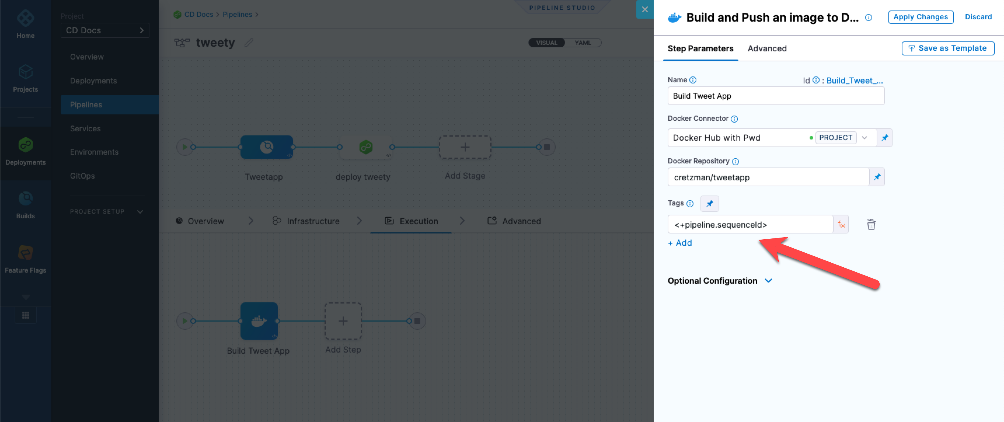 Note the <+pipeline.sequenceId> expression. This is used to tag the artifact pushed to Docker Hub. You can tag your artifact versions in a number of ways. The expression <+pipeline.sequenceId> is incremented each time the pipeline is run.