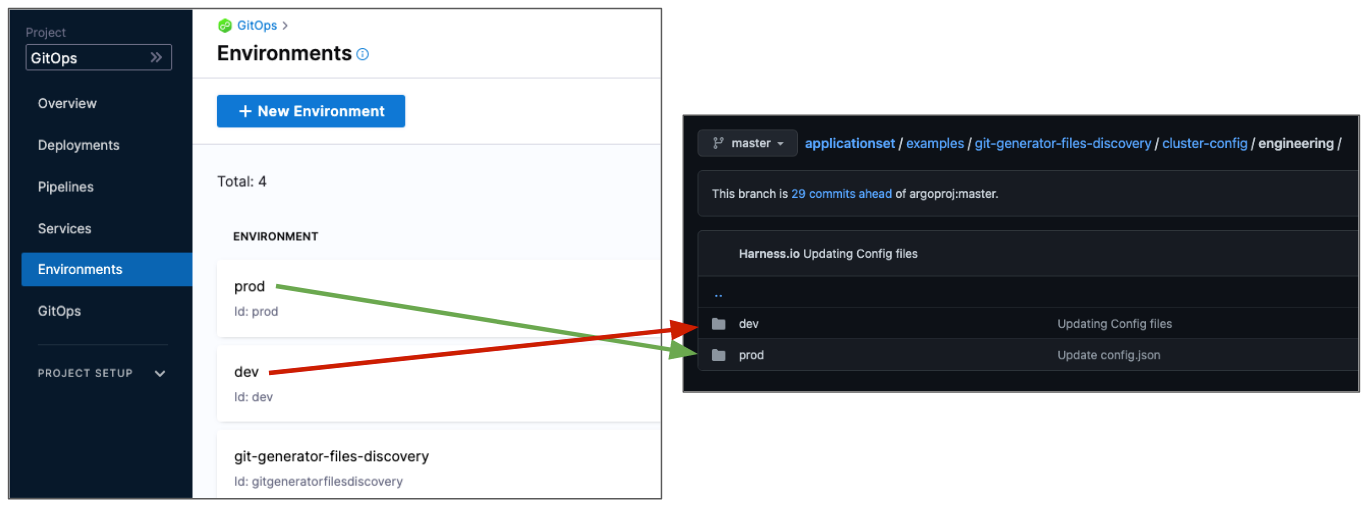 Link the engineering-dev GitOps cluster to the dev environment and engineering-prod GitOps cluster to the prod environment.