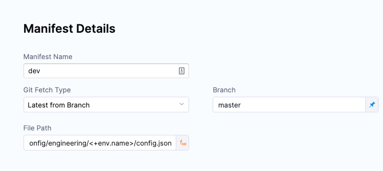 Now we'll define the manifest to use for the PR pipeline. We'll use the path to the config.json files. We'll use the expression <+env.name> in the path so that we can dynamically select the path based on the Harness environment we select: dev or prod.
