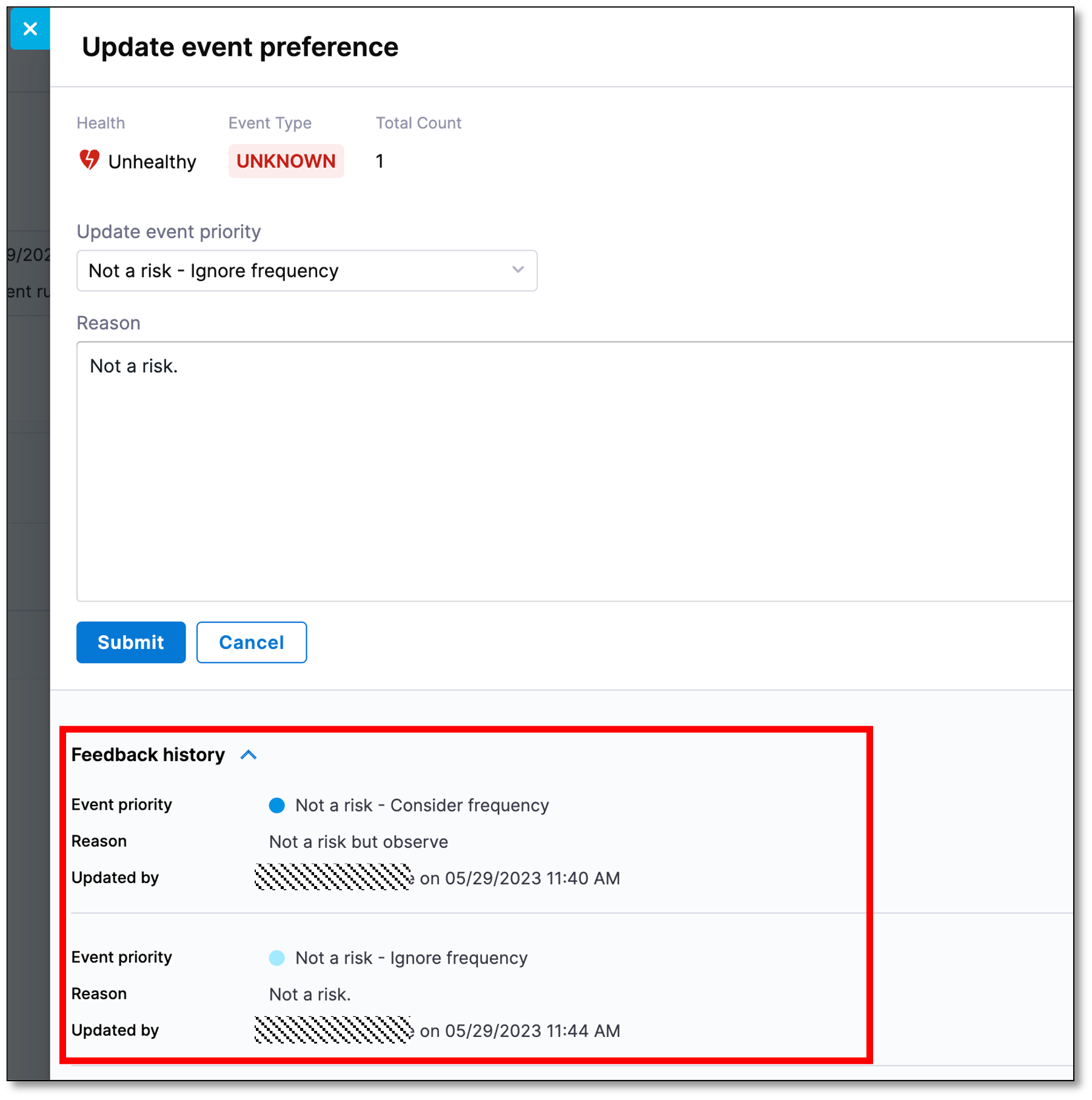 1. On the Update event preference page, select Update event preference, and expand Feedback history. Event feedback details such as event priority, reason, who updated the event priority and the date and timestamp are displayed.