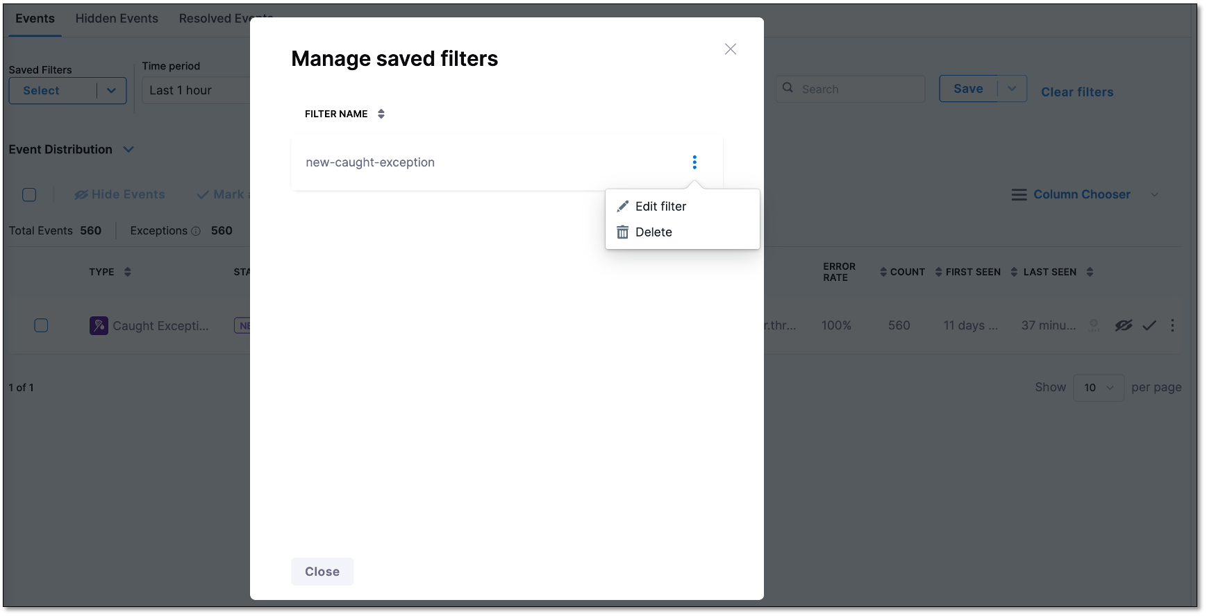 2. Select the settings icon next to the filter setting you want to delete, and then choose Delete Filter. The selected saved filter setting is removed from the Saved Filters list.