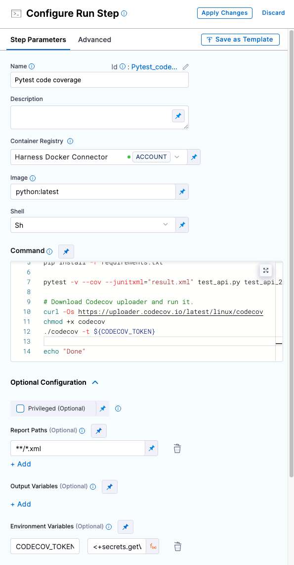 CODECOV_TOKEN: <+secrets.getValue("my_codecov_upload_token")> ## Reference your CodeCov Upload Token secret in an environment variable.