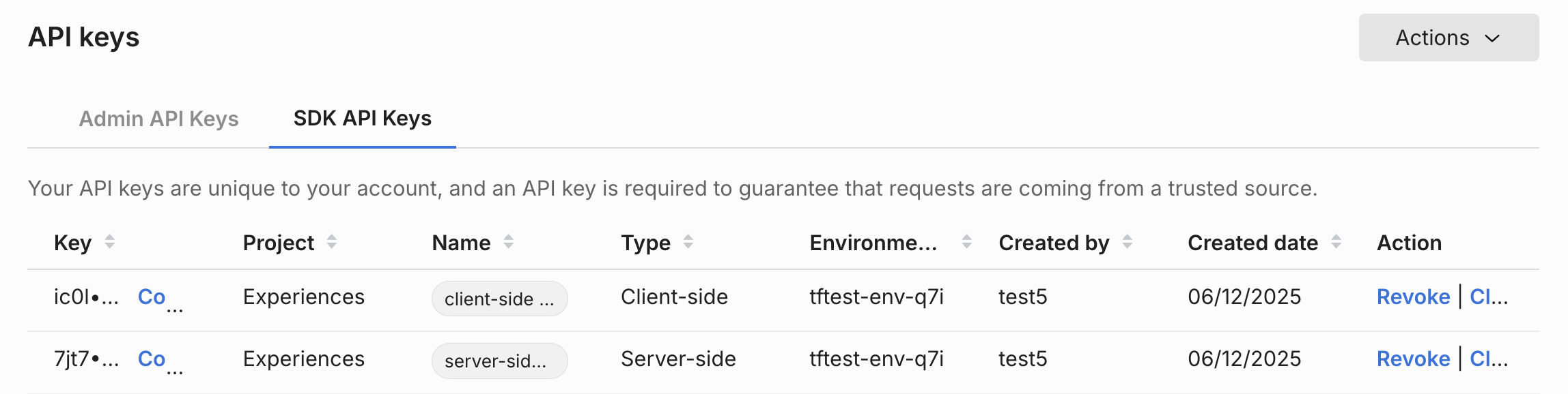 • You need to create an server-side SDK API key. You can create this by navigating to Admin settings and then API keys. Click the Action button and from the menu list, select Create API key in the top right.