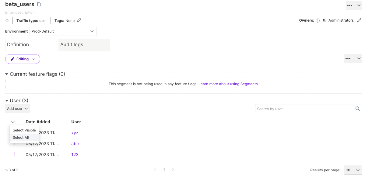 - In Harness FME, you can search a Large segment for a given User ID, but the full list of user IDs in a Large segment cannot be displayed.