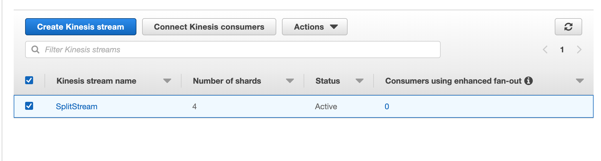 3. Once the Kinesis Stream is created, select its record and click Connect Kinesis consumers.