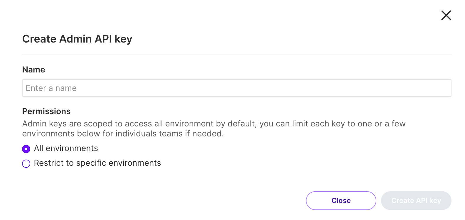 - Specifying a scope for the API key: This limits the reach of the API key across environments, a project, or the whole account.