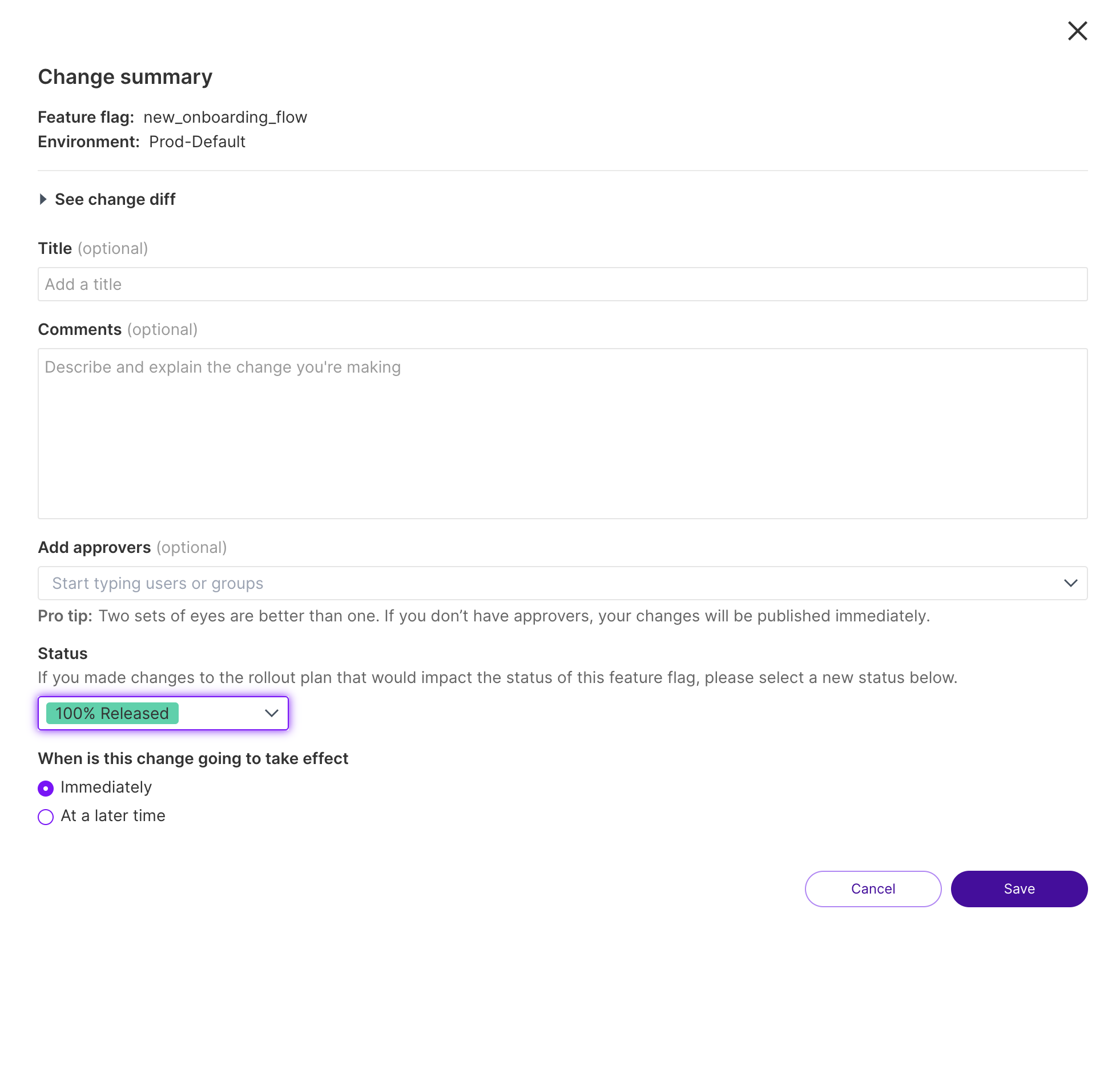 1. After submitting a change to the rollout plan of a feature flag, on the Change summary page, in the Status field, select the desired status, e.g., Internal testing.