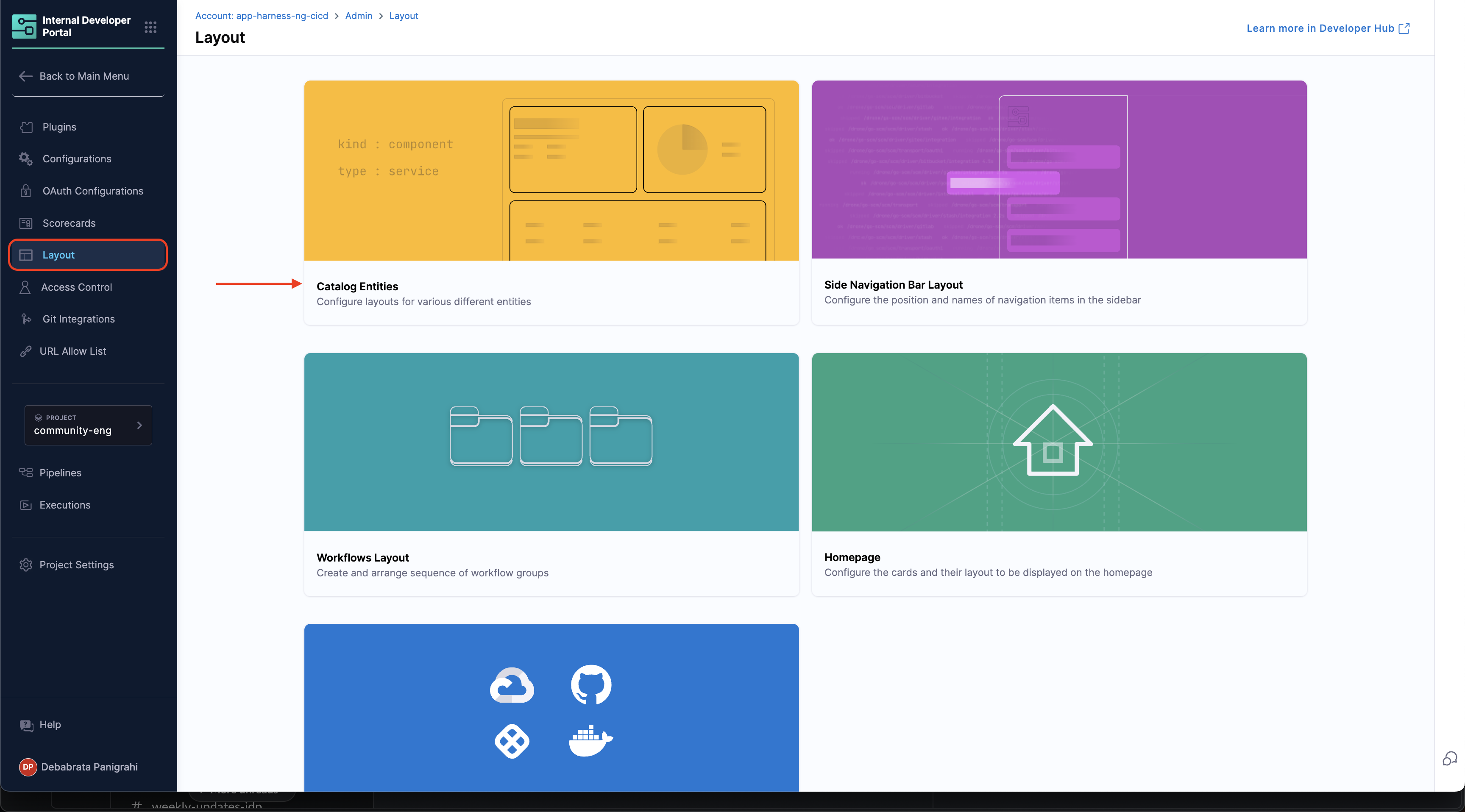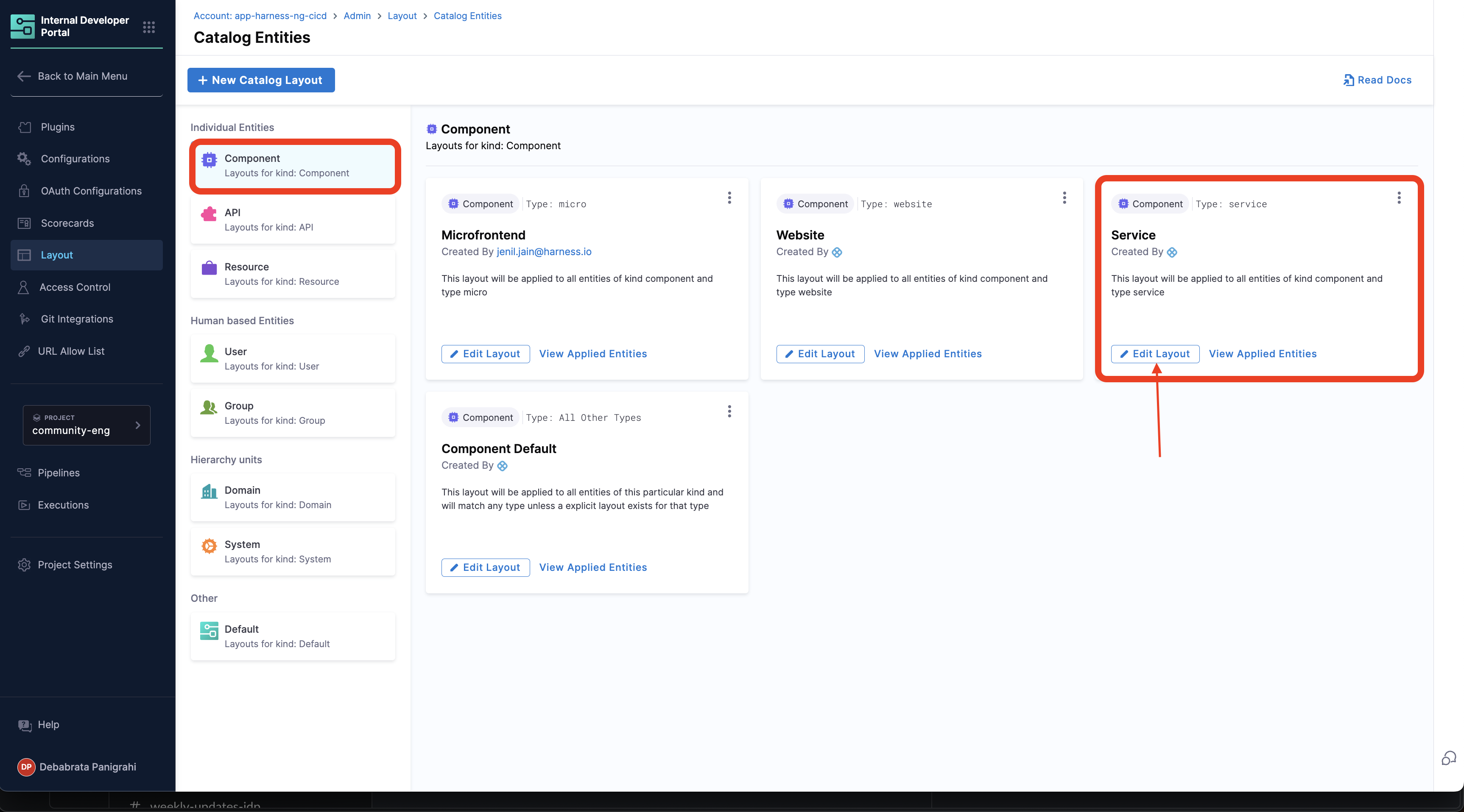 1. Go to the Layout Page and under Admin and select Catalog Entities.