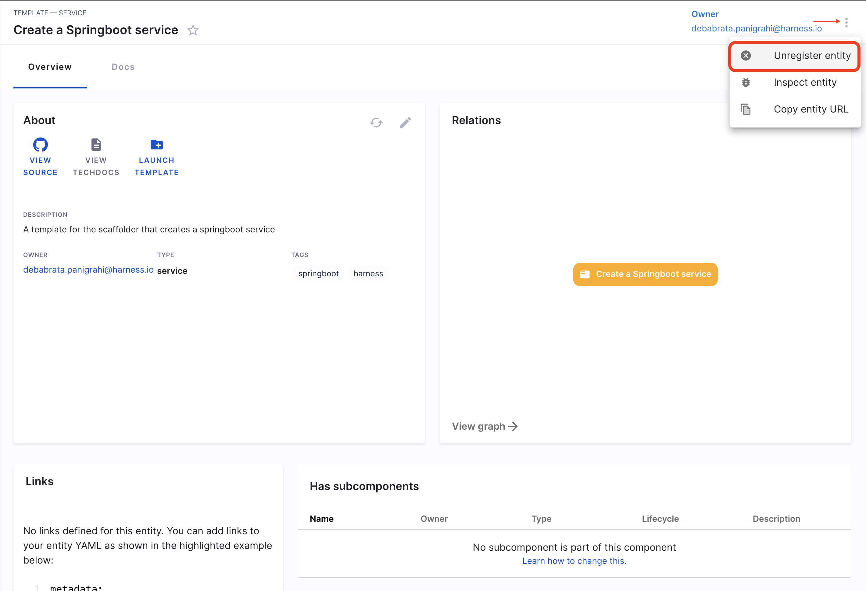 By default the owner is of type Group which is same as the User Group in Harness. In case the owner is a user you have to mention it as user:default/debabrata.panigrahi, and it should only contain the username not the complete email ID.