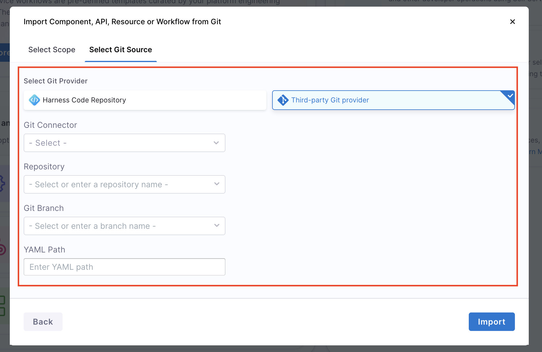 You can create a new entity or workflow in Harness IDP directly from your Git YAML by using this Import flow. Please refer to the following steps to import any entity from Git.