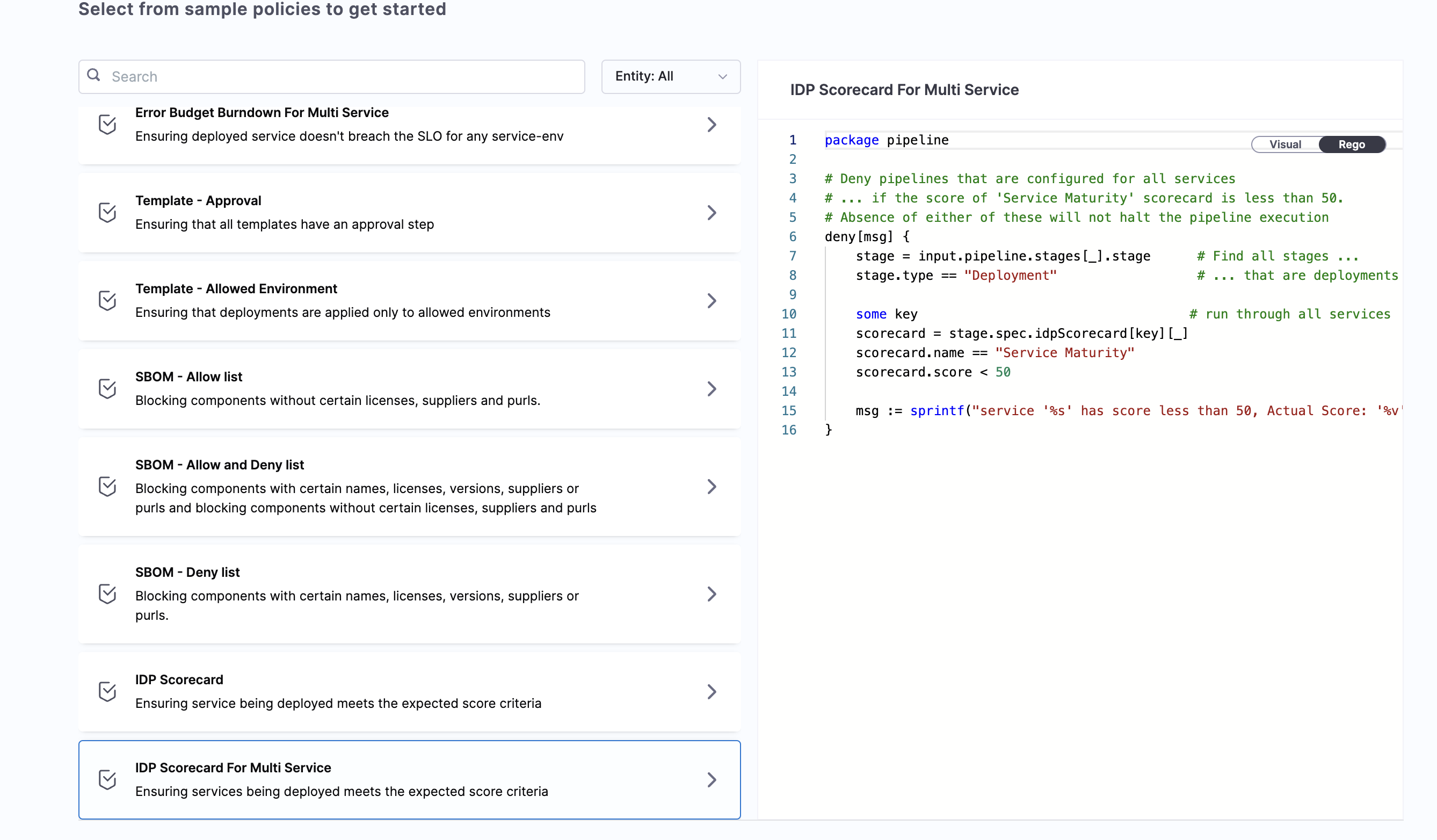3. Policies use OPA authoring language Rego. For more information, go to OPA Policy Authoring.