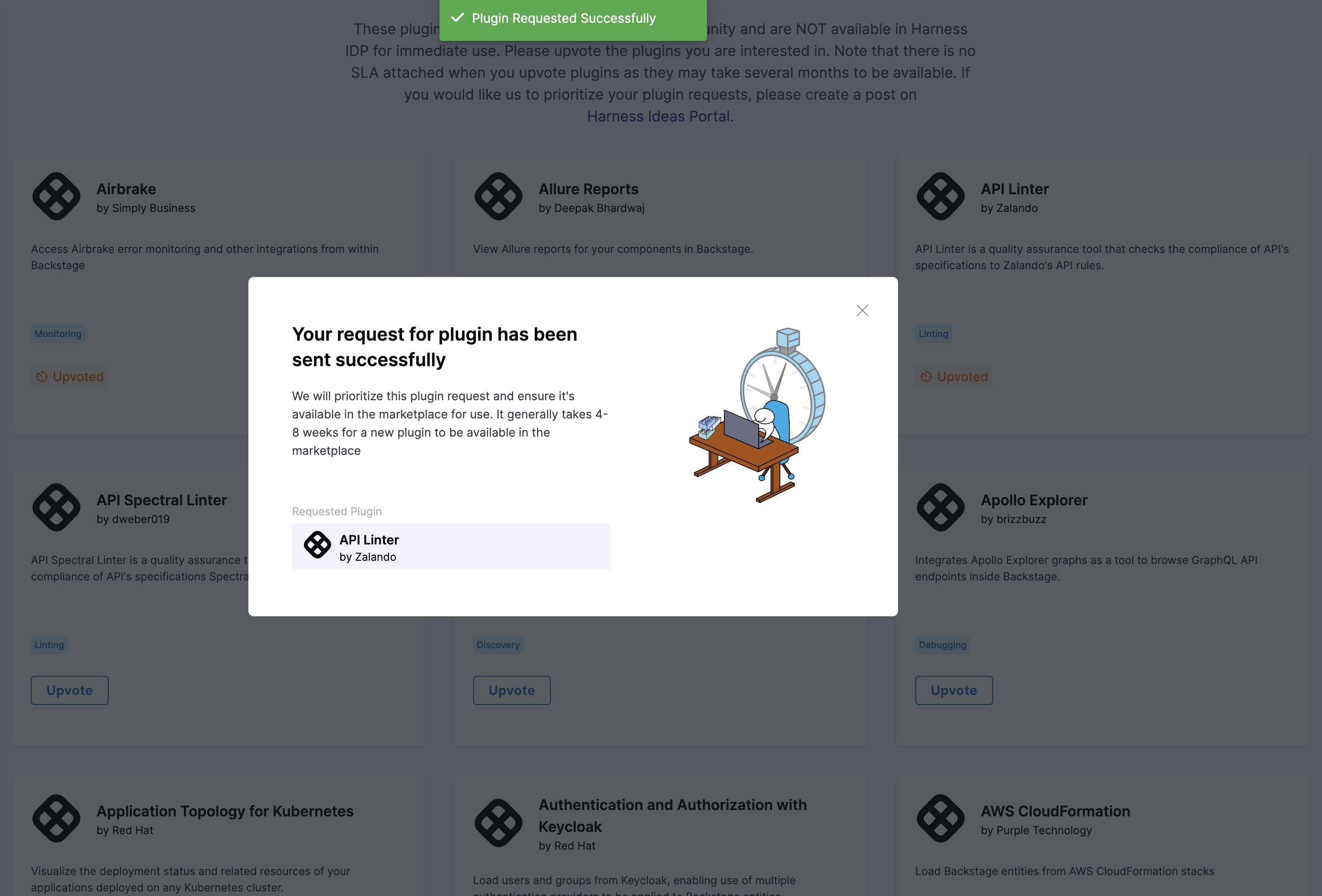 In the "Explore Plugins" view, you can upvote a plugin to be added to Harness IDP. This allows the users to upvote a plugin and help the Harness IDP team prioritize customer requests. The team will review the plugin, scan it for security vulnerabilities, and, if approved, add it to the IDP. It generally takes 4-8 weeks for a new plugin to be available in the marketplace to use.