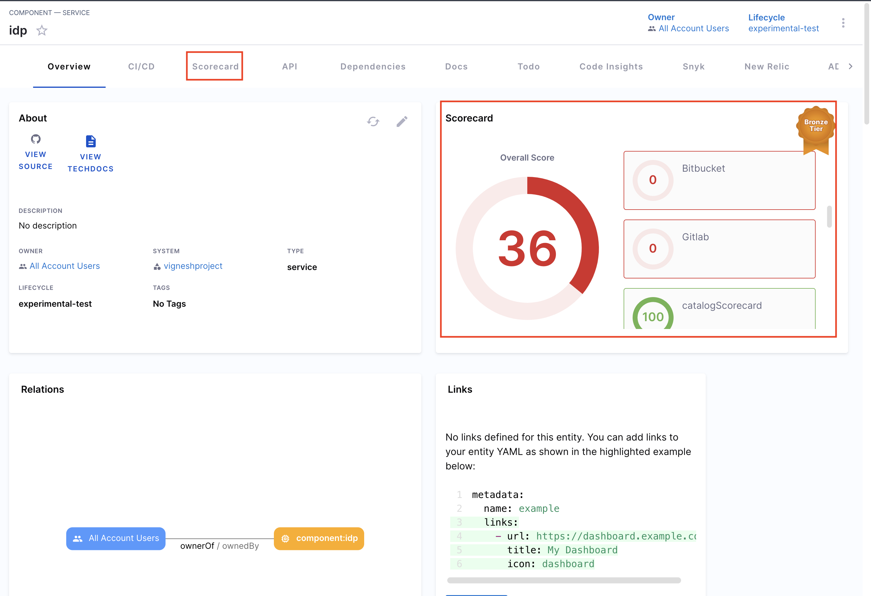 Scorecard has two main UI components which are developer facing and lives in the Catalog - 1. A small Card for the Overview page with the scores and, 2. A Tab view with details of the checks and how the score got computed. This is illustrated below. The Tab view contains detailed comprehensive information as shown in the image under overview