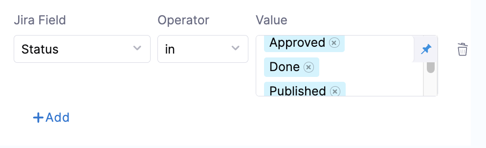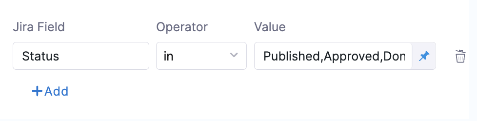 Statusfield to be inApproved,Done, orPublishedwithoutIssue Typecan be specified as: