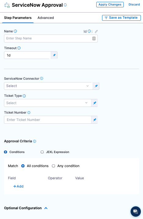 In the pipeline, click ServiceNow Approval. The ServiceNow Approval settings appear.