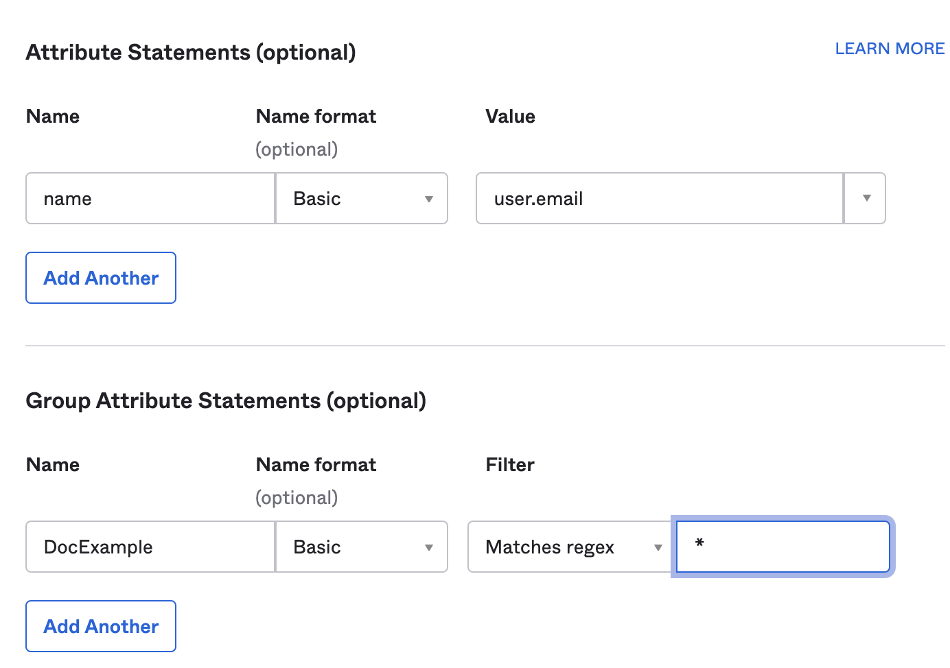 10. In Attribute Statements (optional), enter name in the Name field, select Name Format as Basic, and select the Value as user.email.