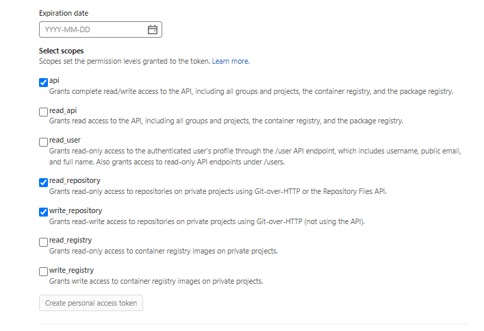 Make sure your personal access token has the following permissions: api, read_repository, and write_repository.