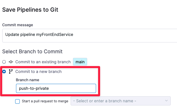 Select Commit to a new branch and enter the branch name. In this case, we save the pipeline in a new branch