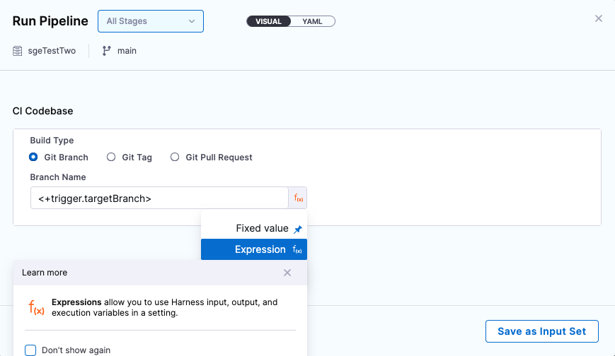 For the Branch Name, select Expression and enter <+trigger.targetBranch> as a runtime expression.