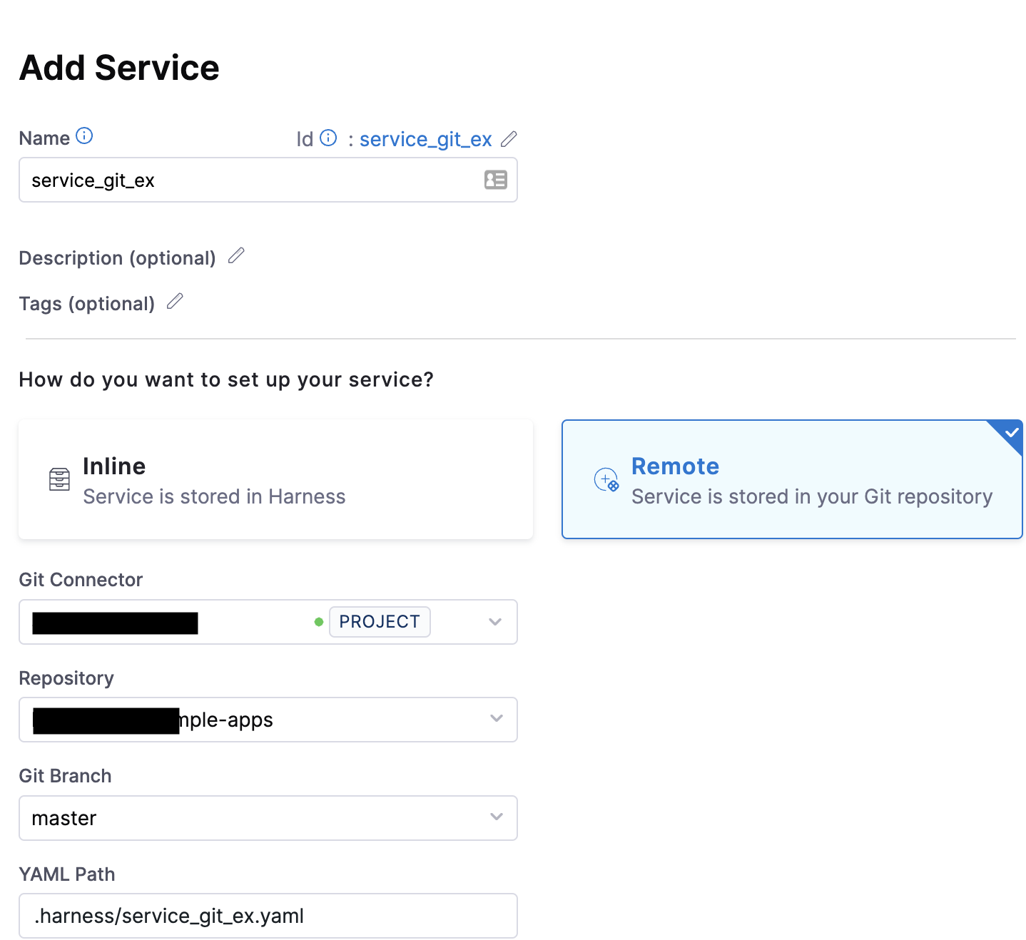 In Git Connector, select or create a Harness Git connector to the repo where you will store the service. For more information, go to Code Repo Connectors.