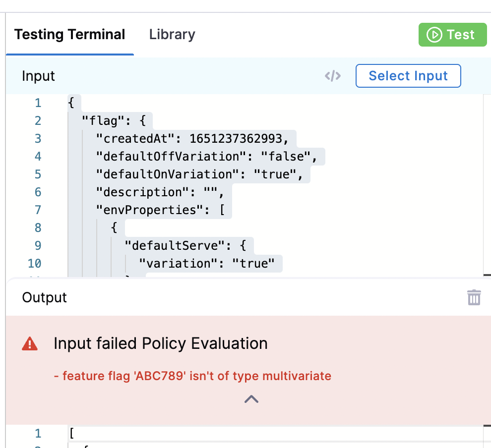 You can only test a policy in the Testing Terminal if you have previously run a Policy Evaluation. If you are creating your first ever policy for the Project, continue to Step 2: Add the Policy to a Policy Set. After you have applied your first policy to a Feature Flag, you can then use the Testing Terminal.