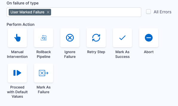 If a step marked as failed has no specified failure strategy, Harness uses the default failure strategy.