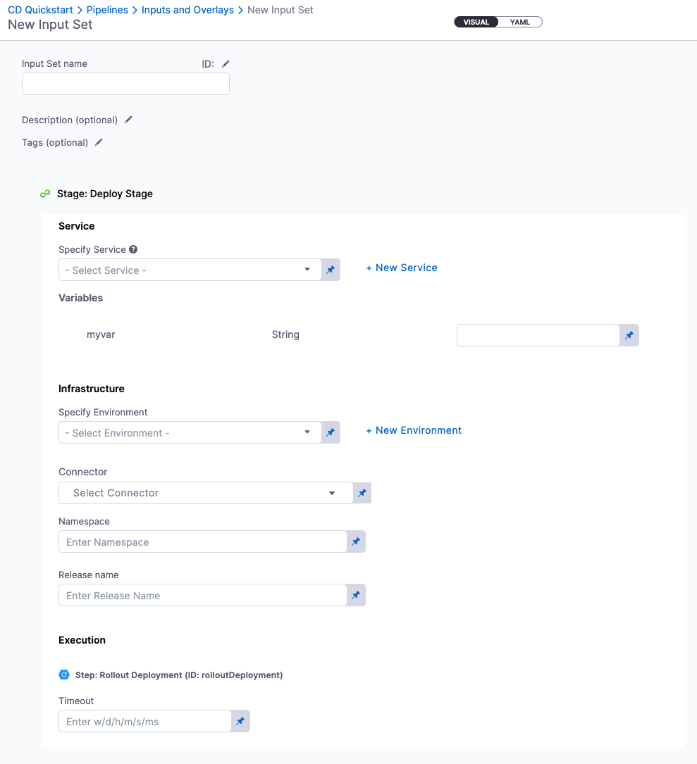 To be included in an input set, settings must be configured to use runtime input. Settings that don't use runtime input can't be included in input sets. You can configure runtime input in either the Visual or YAML editors in the Pipeline Studio.