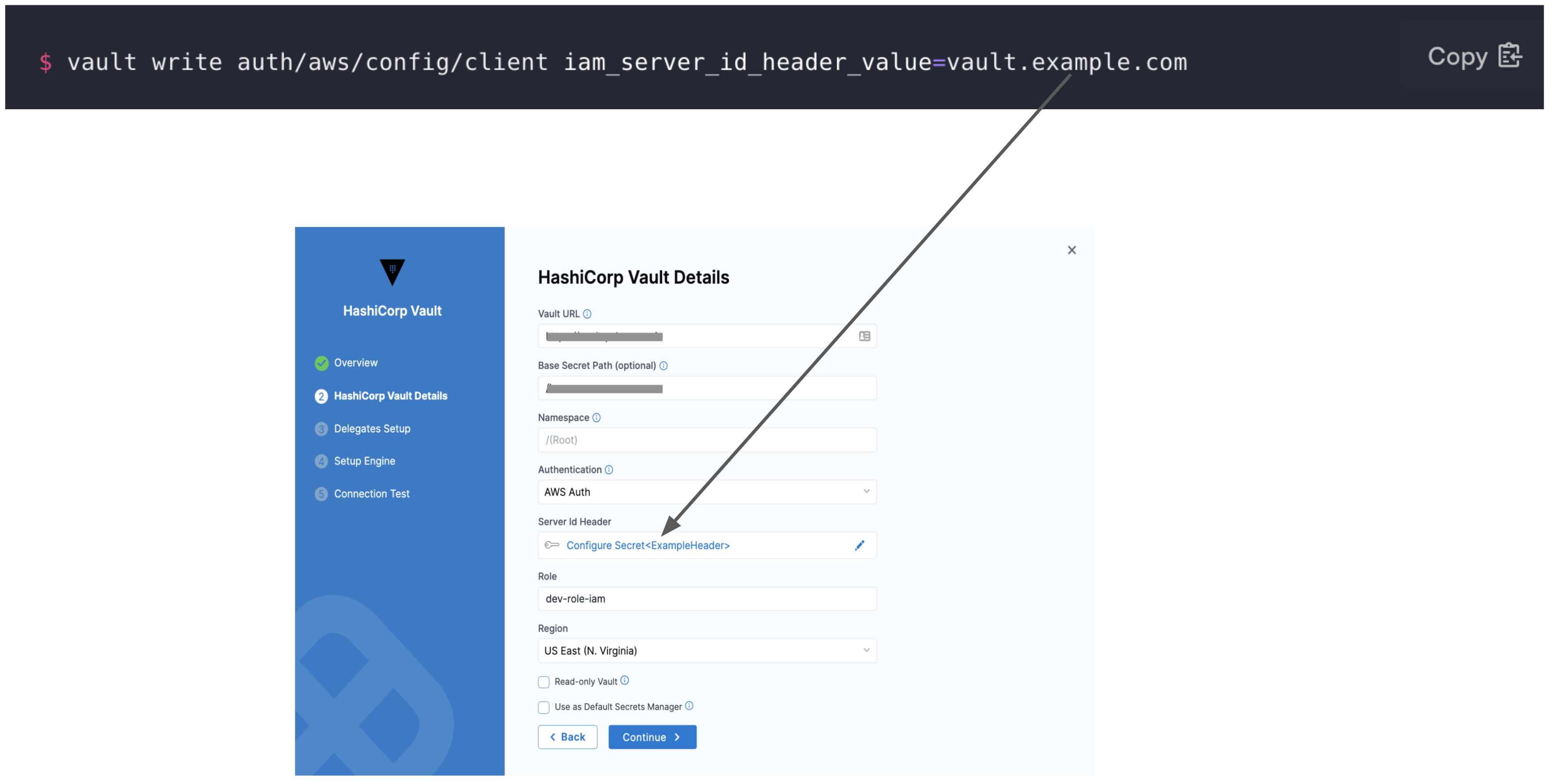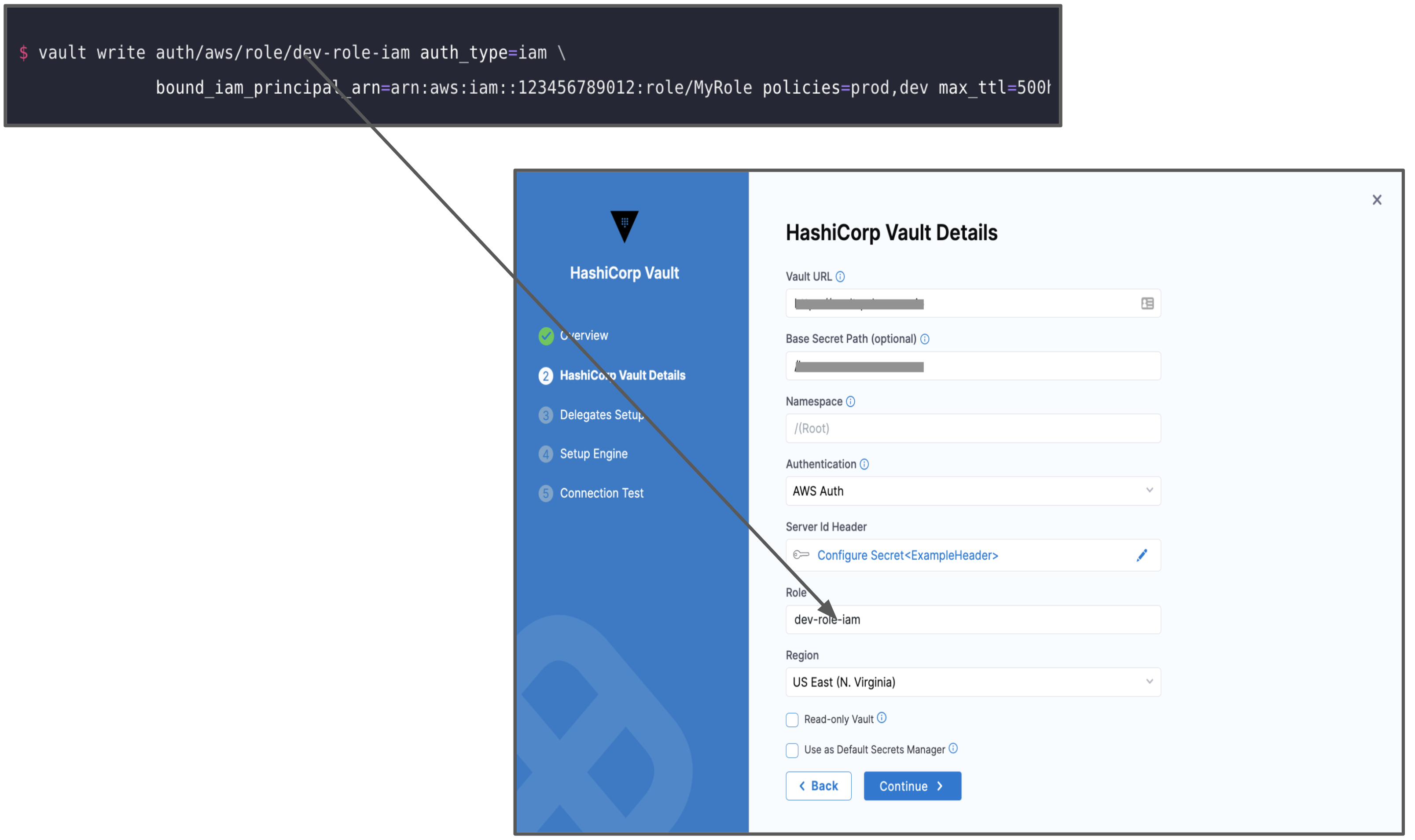 To authenticate with AWS Auth, make sure you have configured the vault with entries for Header, Role, and Region. For more information, go to AWS Auth Method in the Vault documentation.