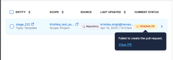 1. Click on Pending PR to view and open the pull request. Click View PR to navigate to the repository and merge it into your default branch, where all entities are stored.
