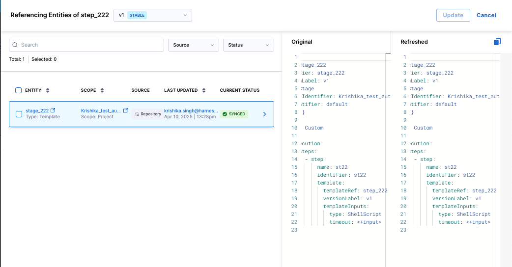 First, you will be asked to update the stage template, and then the pipeline template. You also have the option to Update all unsynced entities at once.