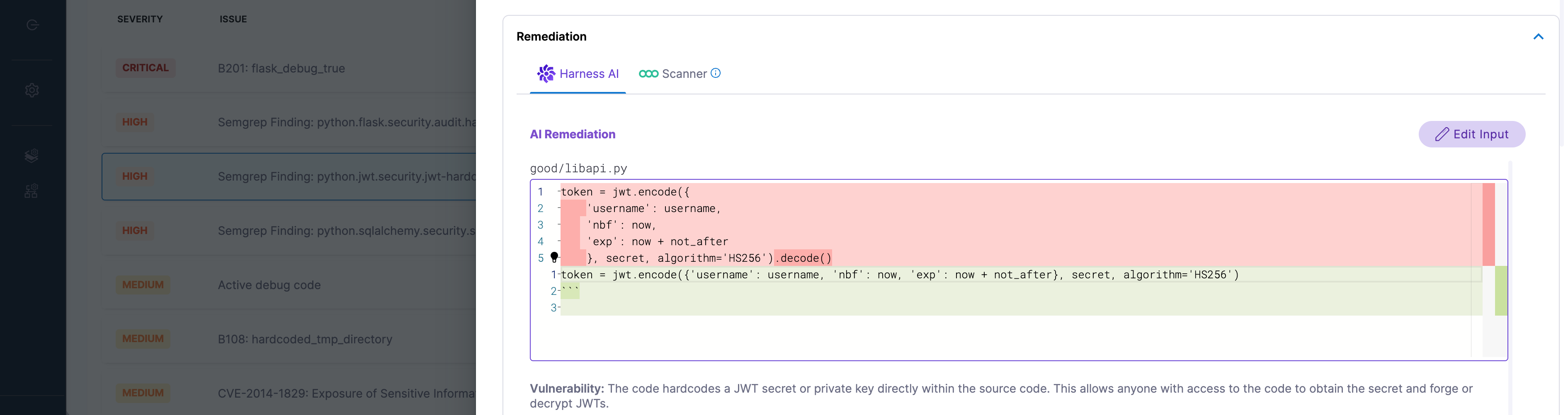 - Remediation: Steps from Harness AI and Scanner (see Fix security issues using Harness AI).
