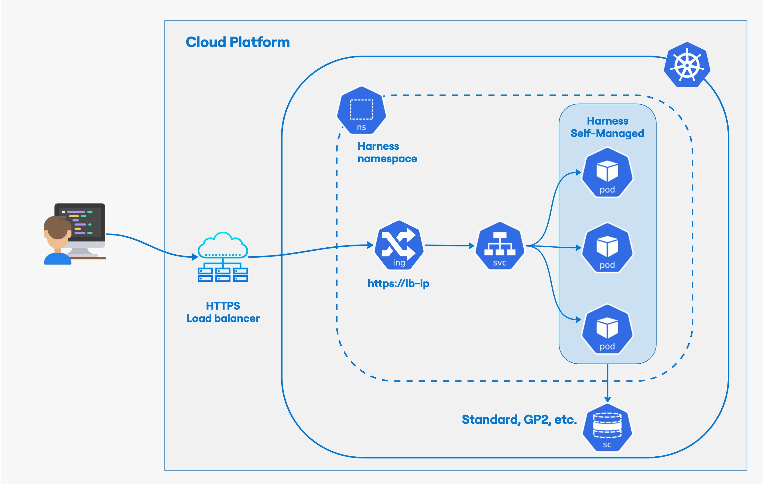 The Self-Managed Enterprise Edition runs within the customer's environment alongside their existing services. As shown below, Customers generally connects Harness through a Load Balancer, which forwards requests to the Load Balancer within the Harness namespace and then to appropriate services respectively.