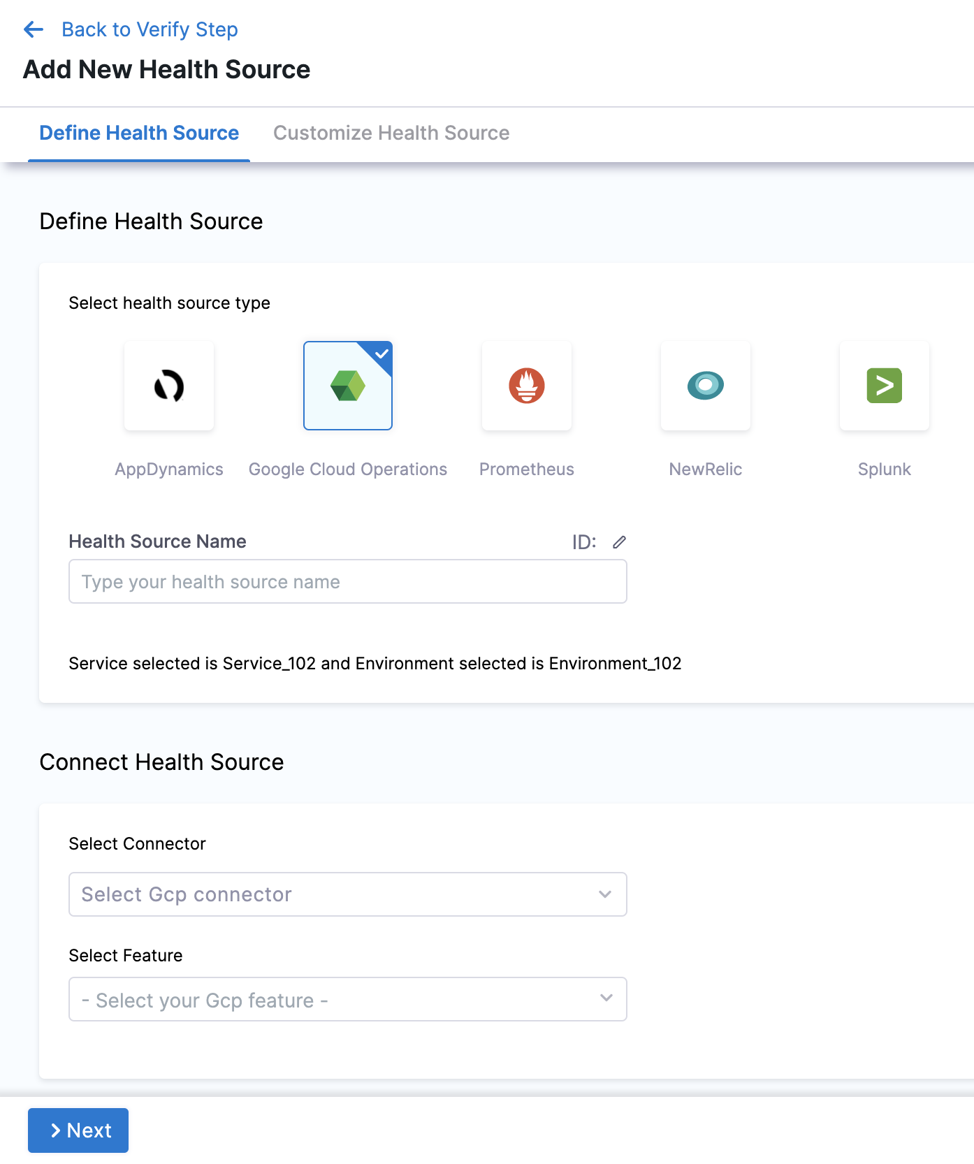 Go to the Service tab, and under Define Your Sources, select + Add New Health Source.