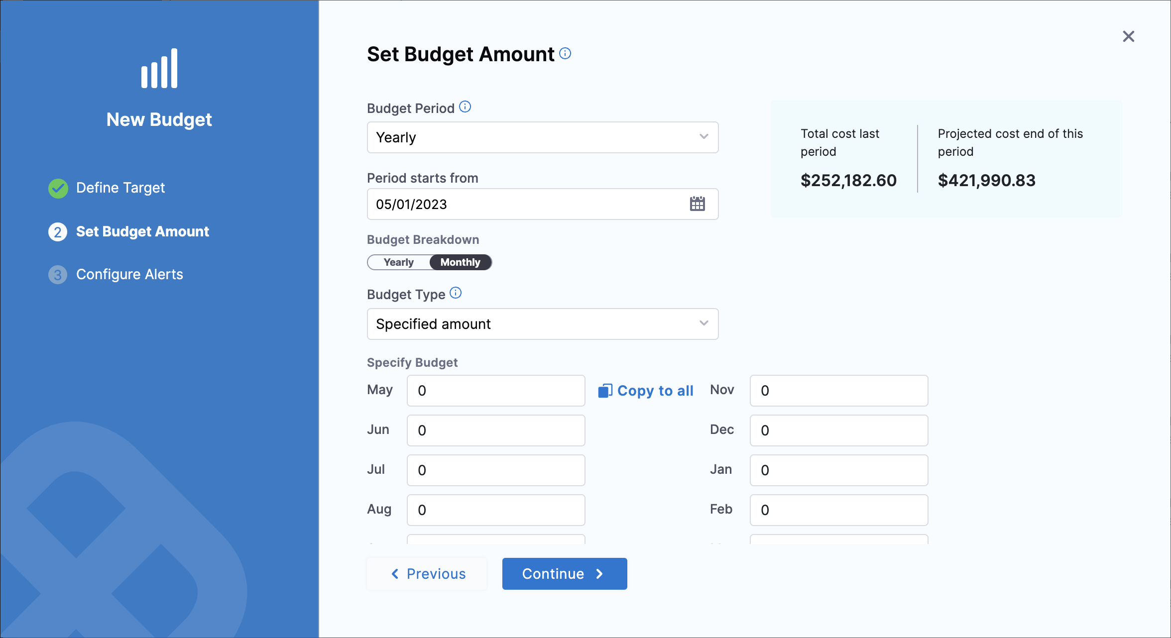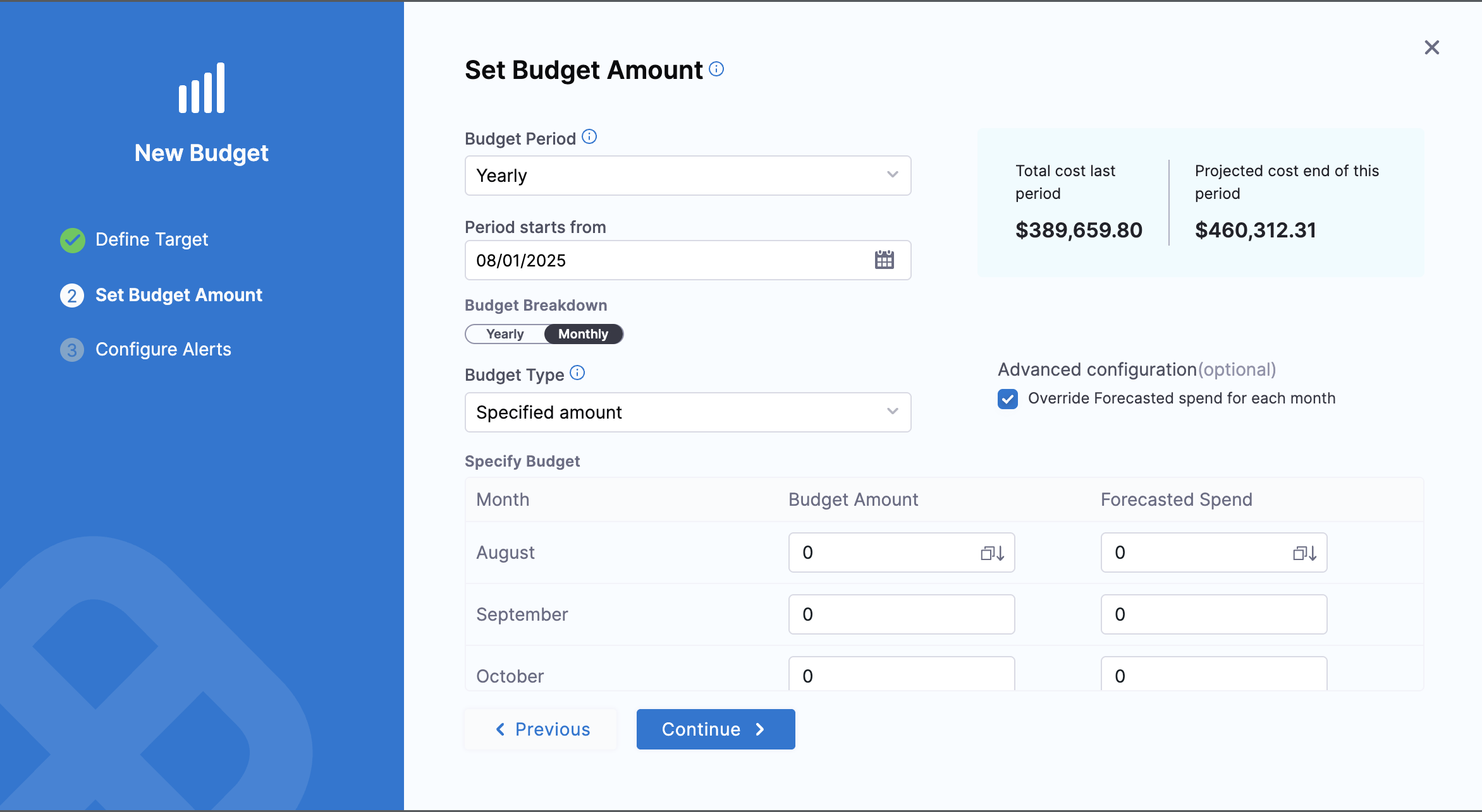 The Budgets tab displays all the budgets in a new consolidated view. Users can drill down into a folder or access the complete budget list for broader visibility. Users can also select which columns they want to see in the Budgets list. This gives them the flexibility to refine their view with the following attributes: Time Period, Budget Amount, Current Spend, Forecast, Forecast vs. Budget, Current Spend vs. Budget, Thresholds, Created By, and Last Modified.